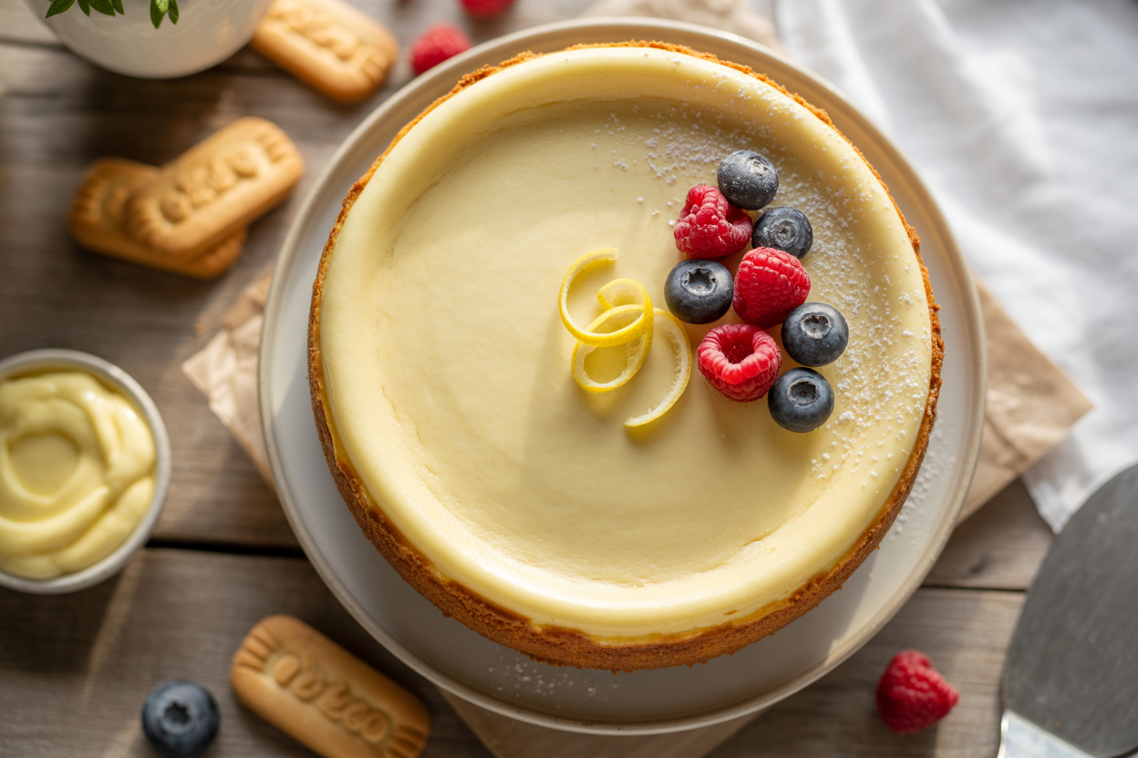 Cremiger, klassischer New York Cheesecake mit zartem Keksboden und feiner Vanillenote – ein echtes Genuss-Highlight für jeden Anlass.
